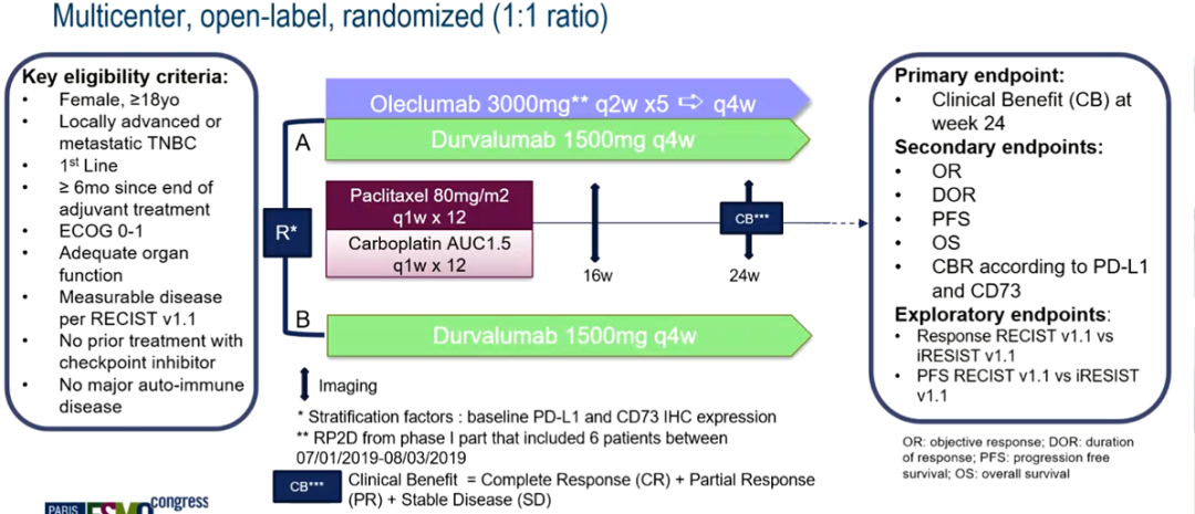 研究方法:研究纳入来自法国和比利时共16个中心,既往未经治疗、不能手术的局部晚期或转移性三阴性乳腺癌患者,按照1∶1随机分组接受治疗。A组:Oleclumab +度伐利尤单抗+紫杉醇+卡铂 ,B组:度伐利尤单抗+紫杉醇+卡铂。后续持续使用度伐利尤单抗 ±Oleclumab,直到疾病进展或发生不可接受的毒性反应或患者要求出组。