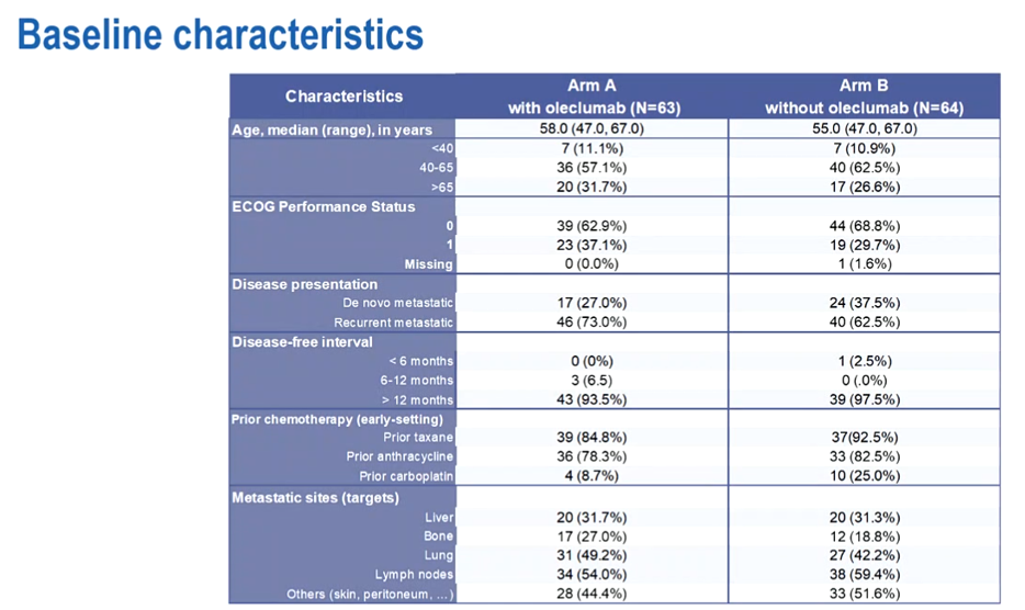 结论:在度伐利尤单抗+卡铂+紫杉醇基础上加用抗-CD73单克隆抗体Oleclumab未能增加晚期三阴性乳腺癌患者第24周的临床获益率。正在进行的转化研究旨在更好地解释本研究联合治疗方案的作用机制。