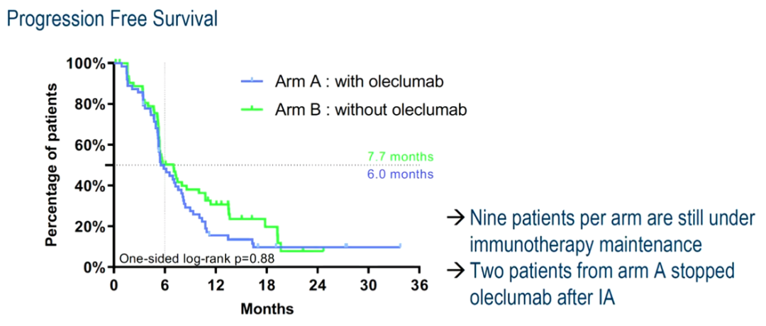 两组中位PFS分别为A组6个月,B组7.7个月(单侧对数秩检验,P=0.88),无统计学意义。两组安全性相似,不良事件可控。