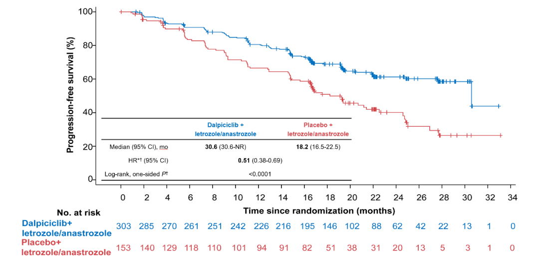 达尔西利是我国自主研发的CDK4/6抑制剂,也是全球第四款CDK4/6抑制剂。徐兵河院士牵头开展的DAWNA-2研究在2022年欧洲肿瘤内科学会年会(ESMO)上报告了研究结果。这是一项多中心、随机对照、双盲的Ⅲ期临床研究,探索了达尔西利一线治疗效果。入组患者为HR+/HER2-乳腺癌,患者复发转移后没有接受过其他系统治疗,随机分至研究组进行达尔西利联合非甾体类芳香化酶抑制剂治疗(包括阿那曲唑或来曲唑),或对照组安慰剂联合阿那曲唑或来曲唑进行治疗。主要研究终点为研究者评估的PFS。中期分析时已达到主要研究终点,达尔西利组中位的PFS为30.6个月,对照组为18.2个月,延长了12.4个月的PFS,HR为0.51,P<0.0001;而且与独立审查委员会评估的PFS相似,HR为0.5。研究证明绝经后或绝经前的晚期乳腺癌,达尔西利联合非甾体类芳香化酶抑制剂一线治疗的疗效明显优于单用芳香化酶抑制剂,总体安全可控。这一研究结果支持达尔西利联合芳香化酶抑制剂作为HR+/HER2-晚期乳腺癌治疗的一线治疗方案。