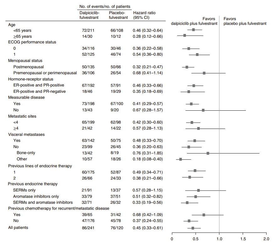 过去认为对于此类患者,内分泌治疗效果差于化疗,而且起效较慢,具有内脏转移或侵袭性较强的进展较快患者一般建议联合化疗,但并不是所有患者均适合联合化疗方案。本研究表明CDK4/6抑制剂联合内分泌治疗的效果甚至优于联合化疗方案。虽然这项Ⅱ期研究不能够改变临床实践,但也促使我们有必要进行Ⅲ期临床研究来证实Ⅱ期临床研究的结果;同时该研究也为内分泌治疗联合CDK4/6抑制剂的去化疗方案提供了新的可能证据,值得进行Ⅲ期临床试验。