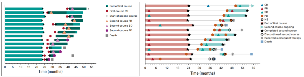 KEYNOTE-042研究[4]中102例患者完成了35个周期(2年)的免疫治疗。84.3%(86/102)最佳治疗反应为CR(n=2)或PR(n=84),中位缓解持续时间(DOR)为38.7个月(4.4-56.0)。26例患者接受了第二阶段帕博利珠单抗治疗,治疗开始后的ORR为15.4%(均为PR),中位PFS为11.3个月,疾病控制率(CR+PR+SD)为76.9%。