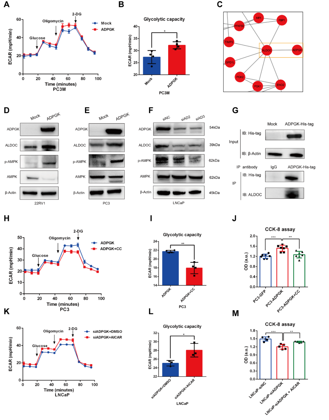 我们利用癌症基因组图谱(TCGA)数据库、在线工具和临床样本评估ADPGK在前列腺癌(PCa)中的表达和与预后的相关性。在体外和体内验证ADPGK对PCa进展的影响。采用定量蛋白质组学、代谢组学和细胞外酸化率(ECAR)来评估ADPGK对PCa糖酵解的影响。通过ADPGK的过表达和敲除、Co-IP、ECAR和CCK-8实验探讨潜在的作用机制。