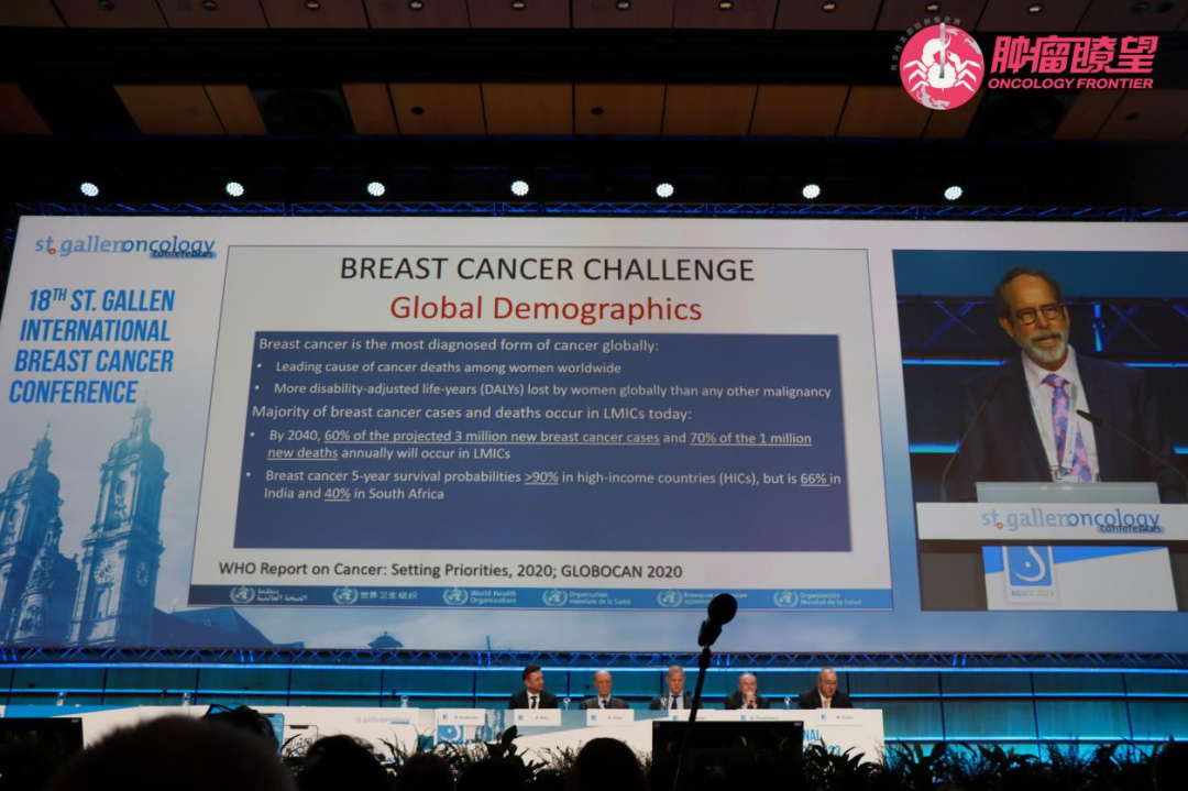 本届大会我们欣赏到了艺术感十足的开场,也了解到了St.Gallen大会的发展历程,同时会上也对St.Gallen创始人、组委会主席Hans Jörg Senn教授进行了纪念。在St.Gallen大会相关奖项的颁发过程中,我们有幸听到了“2023年St.Gallen国际乳腺癌奖”的获得者、著名病理学家Giuseppe Viale教授分享了他的工作历程。他提到,“最初乳腺癌相关的病理工作是只测量肿瘤的大小和数淋巴结数目,后来逐步发展到关注ER、PR、HER2和Ki-67等指标,现在开始对TILs细胞进行记录”。如果没有病理学家,我们无法做到分类治疗,对他们表示由衷的感谢。Giuseppe Viale教授相关工作的开展为乳腺癌患者的治疗提供了跨学科的讨论与探索,也逐步见证了乳腺癌患者治疗愈加精准的过程。