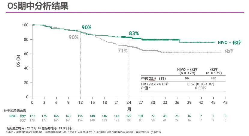 NADIM II研究是一项在ⅢA-ⅢB期NSCLC患者中进行的多中心、随机对照II期临床试验,旨在评估纳武利尤单抗+化疗vs化疗用于可切除NSCLC的新辅助治疗疗效,患者接受3个周期的新辅助卡铂和紫杉醇联合纳武利尤单抗治疗,术后纳武利尤单抗辅助治疗半年。2022 WCLC报道了24个月PFS及OS数据,结果显示,两组pCR率分别为36.8%vs 6.9%(P=0.022);且OS和PFS均可观察到明显获益,纳武利尤单抗联合化疗组和化疗组的24个月PFS率分别为67.3%和52.6%(HR=0.56;95%CI:0.28-1.15),24个月OS率分别为85.3%和64.8%(HR=0.37;95%CI:0.14-0.93)。NADIMⅡ研究初步证实延长围手术期免疫治疗时间可以提高pCR率,提高辅助治疗的疗效,该研究结果仍需进一步在Ⅲ期试验中得以更好验证。