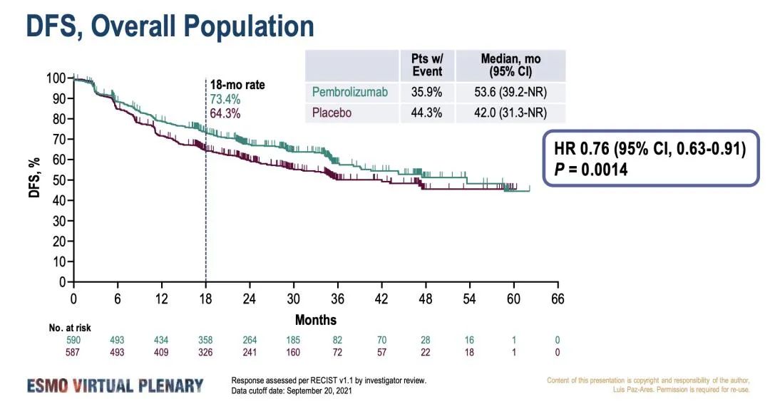 图2 KEYNOTE-091:总人群DFS、PD-L1≥50%患者DFS