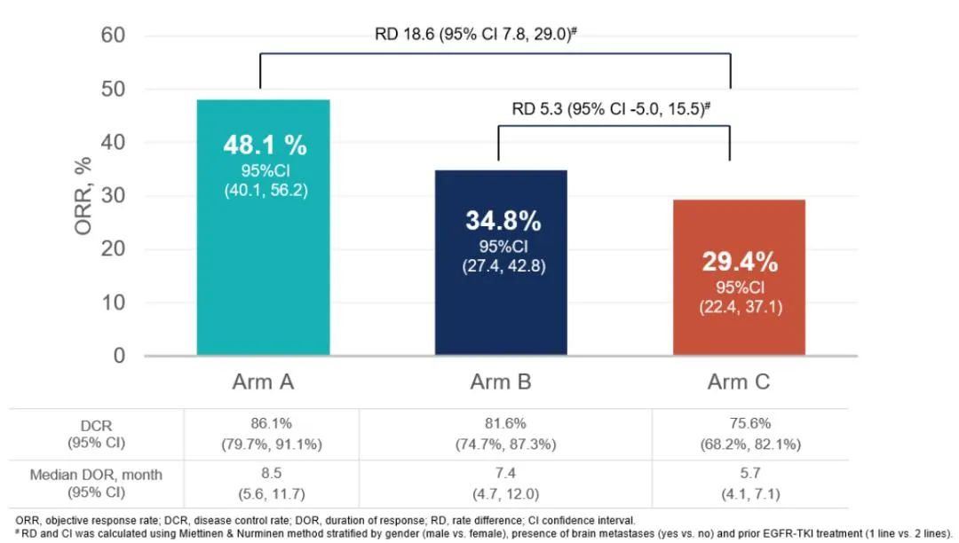 驱动基因阳性一定是免疫治疗的探索“禁区”吗?当然不是。勇者先行,ORIENT-31研究探索了免疫联合方案在EGFR-TKI治疗进展EGFR突变阳性NSCLC患者中的安全性和有效性,该研究的首次中期分析结果于2022年7月正式发表于Lancet Oncology杂志,2022年ESMO大会上,陆舜教授口头报告了ORIENT-31研究的第二次中期分析结果。研究纳入携带局部晚期或转移性NSCLC、EGFR-TKI治疗后进展的EGFR突变阳性NSCLC患者,随机分配(第一阶段为1:1:1,第二阶段为2:2:1)至A组(信迪利单抗+IBI305+化疗)和B组(信迪利单抗+安慰剂+化疗)和C组(安慰剂1+安慰剂2+化疗)。入组患者接受信迪利单抗/安慰剂1(200 mg),IBI305/安慰剂2(15 mg/kg),培美曲塞(500 mg/m2)和顺铂(75 mg/m2),静脉注射,治疗4周期,Q3W。随后,A、B、C组分别接受序贯信迪利单抗+IBI305+化疗、信迪利单抗+安慰剂2+化疗、安慰剂1+安慰剂2+化疗维持治疗。主要终点是按照RECIST v1.1标准评估的无进展生存期(PFS)。2022年3月31日数据截止时,476例患者被随机分配至A组(158例)、B组(158例)和C组(160例),中位年龄为57.0岁,37.0%患者有脑转移。63.0%患者接受了第一代或第二代EGFR-TKI(T790M阴性),26.3%患者接受了第一代或第二代EGFR-TKI后续接受第三代EGFR-TKI(T790M阳性),10.5%患者接受了第三代EGFR-TKI一线治疗。中位随访时间为13.1个月,由独立放射学审查委员会(IRRC)评估的A、B、C组的中位PFS分别为7.2个月、5.5个月和4.3个月。与C组相比,B组的中位PFS显著提高(HR=0.723,95%CI:0.552-0.948;P=0.0181)。由IRRC评估确认的A、B、C组的客观缓解率(ORR)分别为48.1%、34.8%和29.4%。三组的疾病控制率(DCR)分别为86.1%、81.6%和75.6%;三组的中位缓解持续时间(DoR)分别为8.5个月、7.4个月和5.7个月。三组的3级及以上治疗期间出现的不良事件发生率分别为59.5%、46.2%和56.9%。ORIENT-31是首项采用PD-1抑制剂、抗VEGF单抗和含铂双药治疗EGFR-TKI治疗进展后患者的前瞻性、双盲、随机对照的III期临床试验。与单纯化疗相比,四药联合或三药联合均可明显改善EGFR-TKI治疗进展后患者的PFS,且耐受性良好。研究提示对于EGFR-TKI进展的EGFR突变患者,后续要使用免疫治疗,不能忽略再加用“贝伐珠单抗”四药联合可能是EGFR-TKI失败后的一种选择。