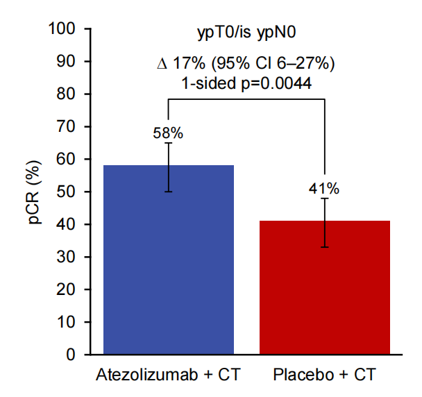 研究背景:IMpassion031研究达到了主要目标,在eTNBC患者中,阿替利珠单抗(atezolizumab)联合化疗显著提高了病理完全缓解(pCR)率。在意向性治疗[ITT]人群中,相较于化疗组,阿替利珠单抗(atezolizumab)联合化疗组的pCR率提升了17%(58%vs 41%;单侧P=0.0044)且无论PD-L1状态如何,均观察到阿替利珠单抗治疗的获益。