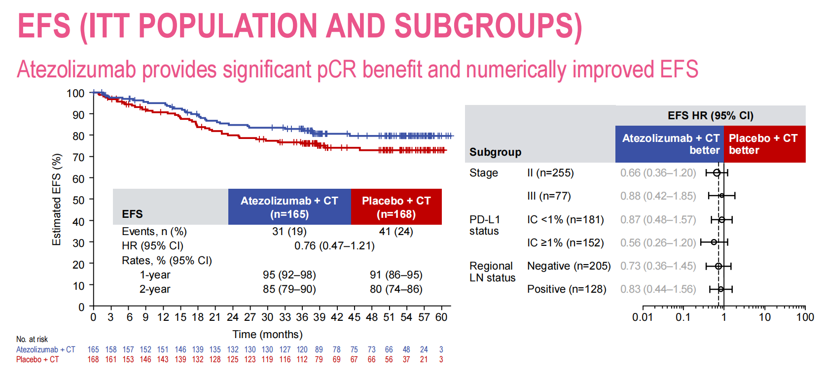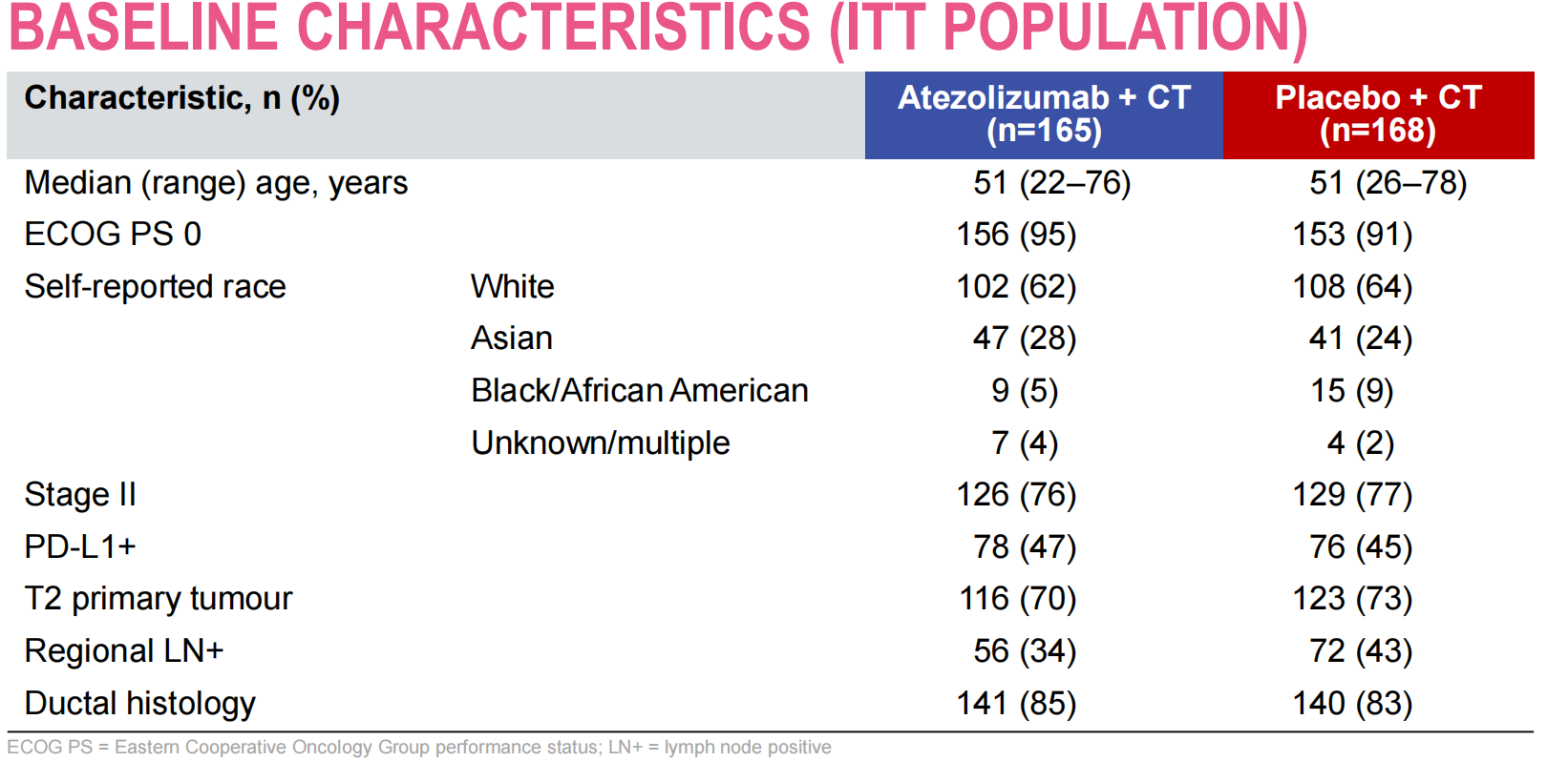 在IMpassion031研究中,两组人群的基线特征是非常均衡的。PD-L1阳性人群,阿替利珠单抗组和安慰剂组的比例分别为47%和45%;淋巴结阳性人群,两组患者的比例分别为34%和43%。