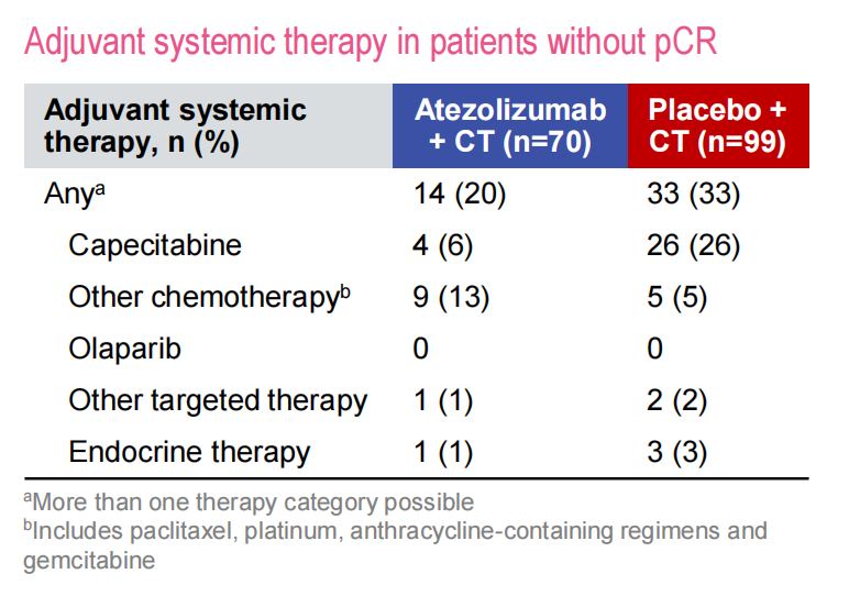 随机化后,IMpassion031研究允许没有达到pCR的人群进行辅助强化治疗,如应用卡培他滨进行化疗。安慰剂组26%的患者使用卡培他滨进行强化治疗,比例相对较高。而阿替利珠单抗组只有6%的患者接受了卡培他滨治疗。同时,一些医生也选择了其他化疗方案,如铂类药物、紫杉类或者蒽环类药物。