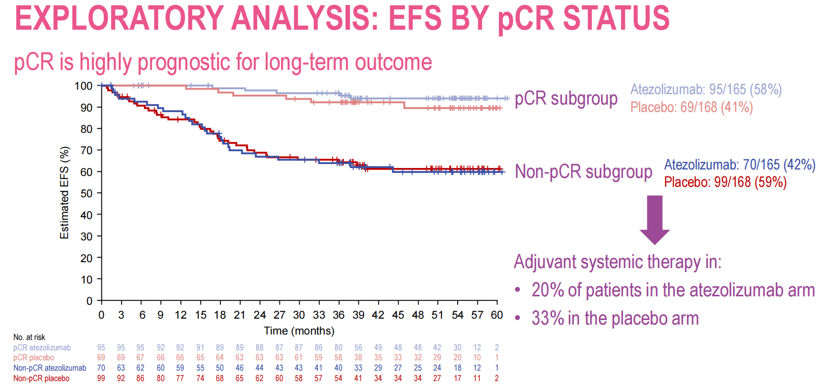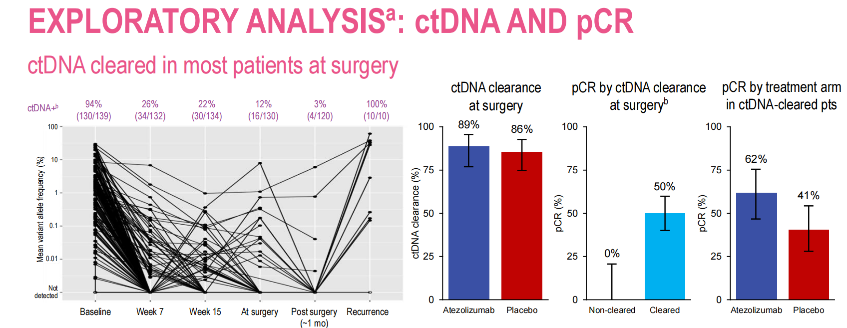 研究结果:经过中位39个月的随访,在各关键临床亚组中,EFS、DFS和OS在数值上均有较好的表现。在未达到pCR的患者中,阿替利珠单抗组14/70(20%)和安慰剂组33/99(33%)均接受了额外的辅助全身性治疗,最常见的是卡培他滨(4/70[6%]vs 26/99[26%])。在探索性分析中,pCR对长期结局具有高度预后意义。探索性ctDNA分析表明,大多数患者(包括所有ctDNA可评估且pCR的患者)在手术时被清除。手术时或术后ctDNA阳性与不良预后相关。阿替利珠单抗组未出现新的安全信号,也未出现与治疗相关的死亡。
