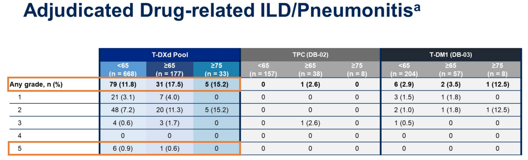 在毒副作用方面,<65岁和≥65岁人群的≥3级治疗期间不良事件(TEAEs)(53.6%vs 65.5%)、严重TEAEs(24.3%vs 32.2%)、导致停药的治疗相关不良事件(TRAEs)(18.7%vs 25.4%)、导致减剂量的TRAEs(24.4%vs 28.8%)发生率整体上相似。对于大家比较关注的间质性肺病(ILD)/非感染性肺炎,<65岁和≥65岁患者的任何级别事件率分别为11.8%和17.5%,5级事件率则仅分别为0.9%和0.6%。总体来看,T-DXd治疗不同年龄人群是比较安全的。