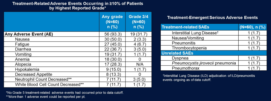 HER3-DXd的疗效不受HER3表达水平的影响,即使HER3低表达患者也有相当不错的疗效。这一点再次告诉我们,利用不同靶点抗体和高活性DXd偶联而成的ADC,可能都有不错的疗效,而且不依赖于靶点的表达水平。另外,该研究中HER3-DXd的安全性良好,常见的不良事件是恶心(50%)、疲劳(45%)、腹泻(36.7%)、呕吐(31.7%)、贫血(30%),≥3级TRAEs为32%,这些都是临床中比较可接受的毒副作用。