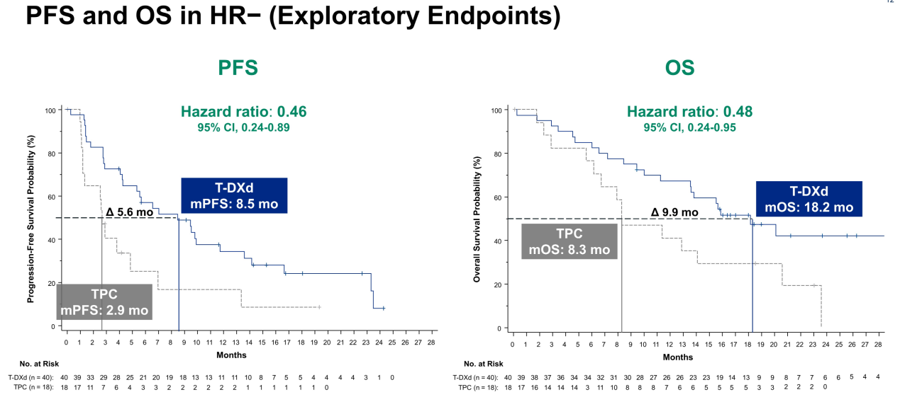 在疗效方面:DESTINY-Breast04研究的激素受体(HR)阴性亚组14显示,在HR-/HER2低表达人群(即TNBC HER2低表达)的二线及其后治疗中,相较于医生选择的化疗方案(TPC),T-DXd可显著改善患者mPFS,为8.5个月vs 5.6个月(HR=0.46;95%CI,0.24-0.89);同时也可显著改善患者mOS,为18.2个月vs 8.3个月(HR=0.48;95%CI,0.24-0.95)。