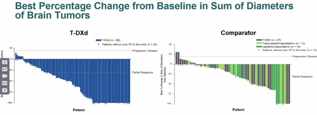 脑转移既往经治的中位治疗线数为3(1.0-14.0)。T-DXd治疗组和对照组中的基线存在脑转移患者分布也一致,均约70%为稳定性脑转移患者,约30%为活动性脑转移患者。