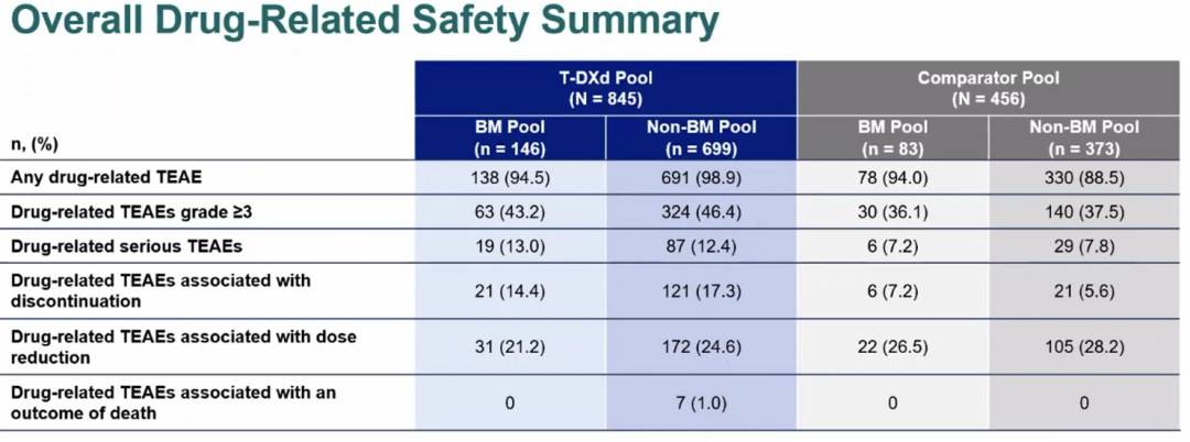 在安全性方面,T-DXd治疗组的mDoT更长(12.7个月vs.5.6个月)[3]。T-DXd治疗脑转移人群中出现任意级别TEAE和≥3级治疗相关TEAE比例与对照组相似,分别为94.5%vs.94.0%、43.2%vs.36.1%。与停药和剂量减少相关的TEAE发生率在基线存在脑转移患者和基线不存在脑转移患者中相似。
