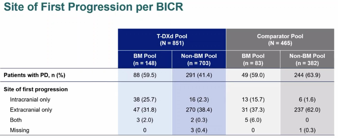 T-DXd治疗后的脑转移缓解情况较为明显,而对照组的缓解情况则相对较小。BICR分析表明,两组间的PD患者比例相似。