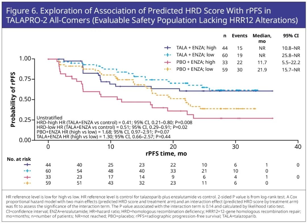 此HRD评分与HRR12m状态具有相关性,接受TALA+ENZA的患者,在HRD-高和HRD-低评分中均显示出更好的rPFS,在无HRR12突变的亚组中,TALA+ENZA组也存在优势。