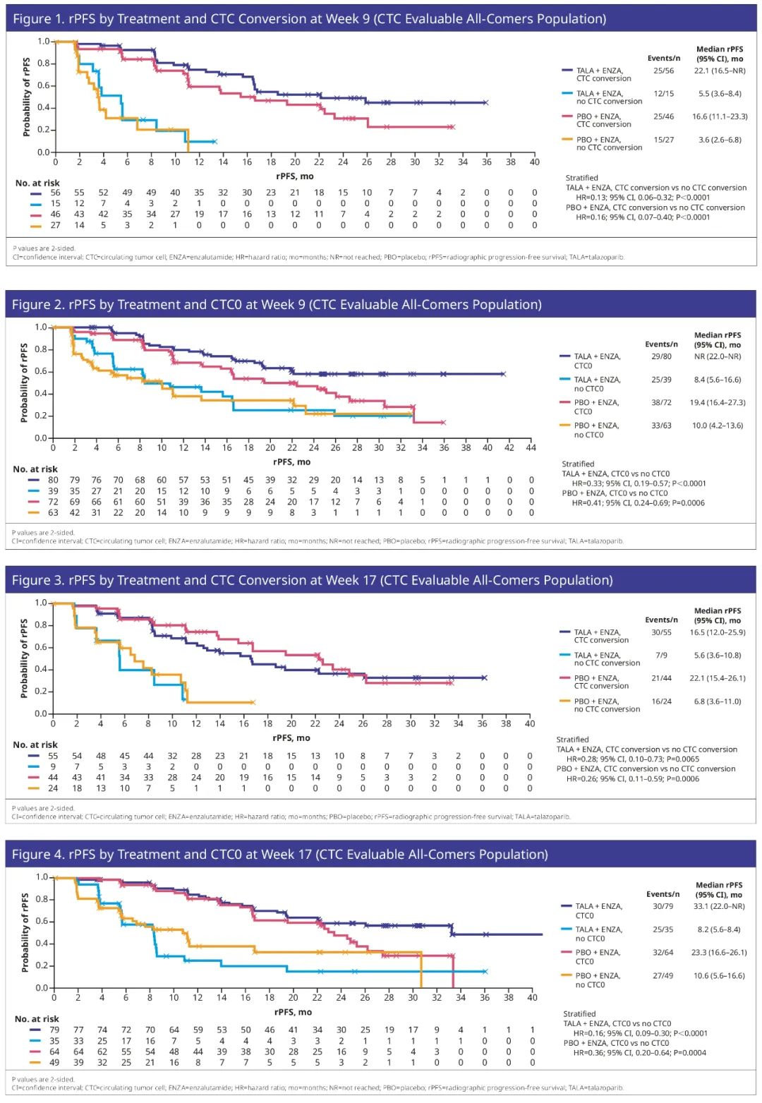 第9周时,144例患者可评价CTC变化(TALA+ENZA组71例,PBO+ENZA组73例),CTC0有254例(TALA+ENZA组119例,PBO+ENZA组135例)。第17周时,132例患者可评价CTC变化(TALA+ENZA组64例,PBO+ENZA组68例),CTC0有227例(TALA+ENZA组114例,PBO+ENZA组113例)。两个治疗组在第9周和第17周的CTC计数减少证明了rPFS的改善。在第9周和第17周时CTC0也能说明两组rPFS获益的预后。