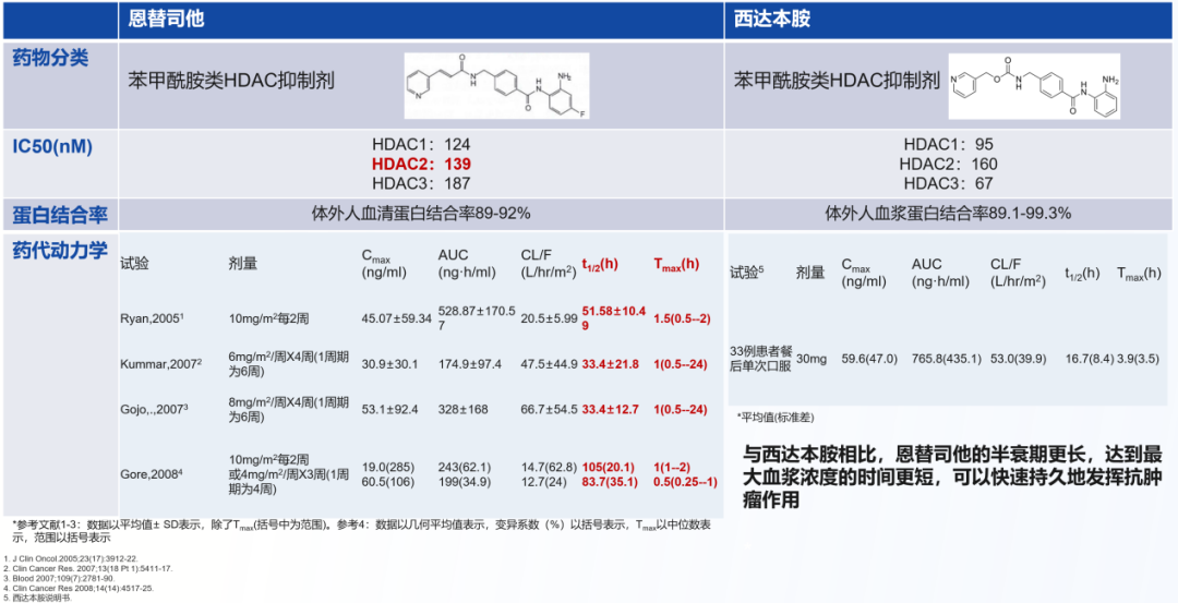 长效制剂的开发是提升患者依从性和生活质量的必要手段,不仅可以保持更稳定的血药浓度、更低的给药频率,也会进一步提升患者生活质量和用药依从性,进而保障治疗效果[16]。在HR+乳腺癌治疗的后CDK4/6i时代,HDAC抑制剂(HDACi)发挥着举足轻重的作用,目前我国已获批的HDACi包括西达本胺和恩替司他。西达本胺的终末消除半衰期较短,约为17h,相应用药方法为每周口服2次,每次30mg(6片)[17]。恩替司他的半衰期则约为52~62h,每周口服1次,每次5mg(1片)[18]。自此,相对更长效的恩替司他以更便捷、更简易的用药方式开启了HR+乳腺癌的“周疗”时代,从药物设计层面响应CDE“以患者为中心”的要求,为改善患者治疗体验、提升患者依从性发挥中国创新的力量(表3)。