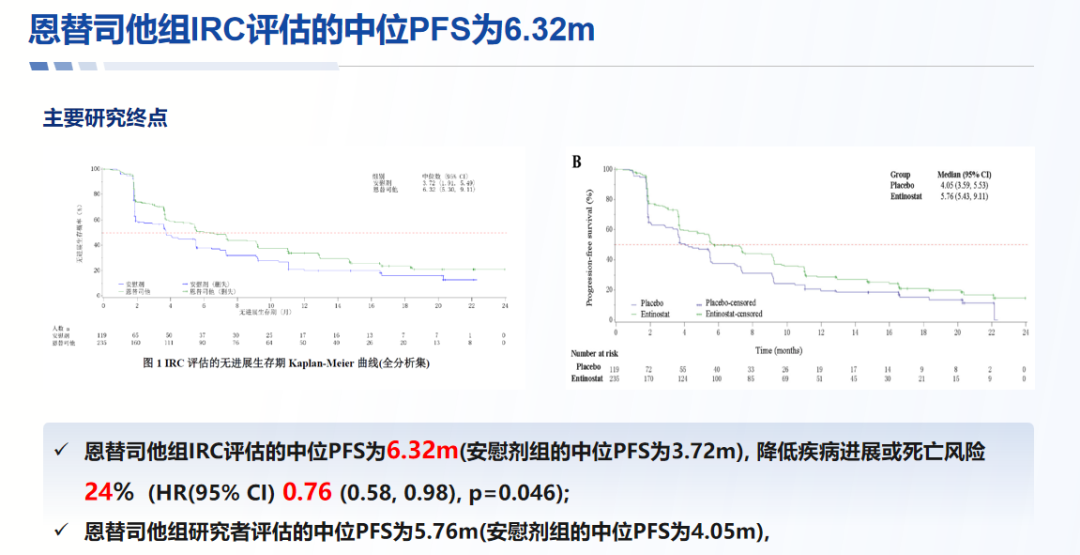 中位随访15.7个月,恩替司他组与安慰剂组对比显示:IRC评估mPFS得到显著改善,为6.32 vs.3.72个月(图3),降低了24%的疾病进展或死亡风险(HR=0.76)。